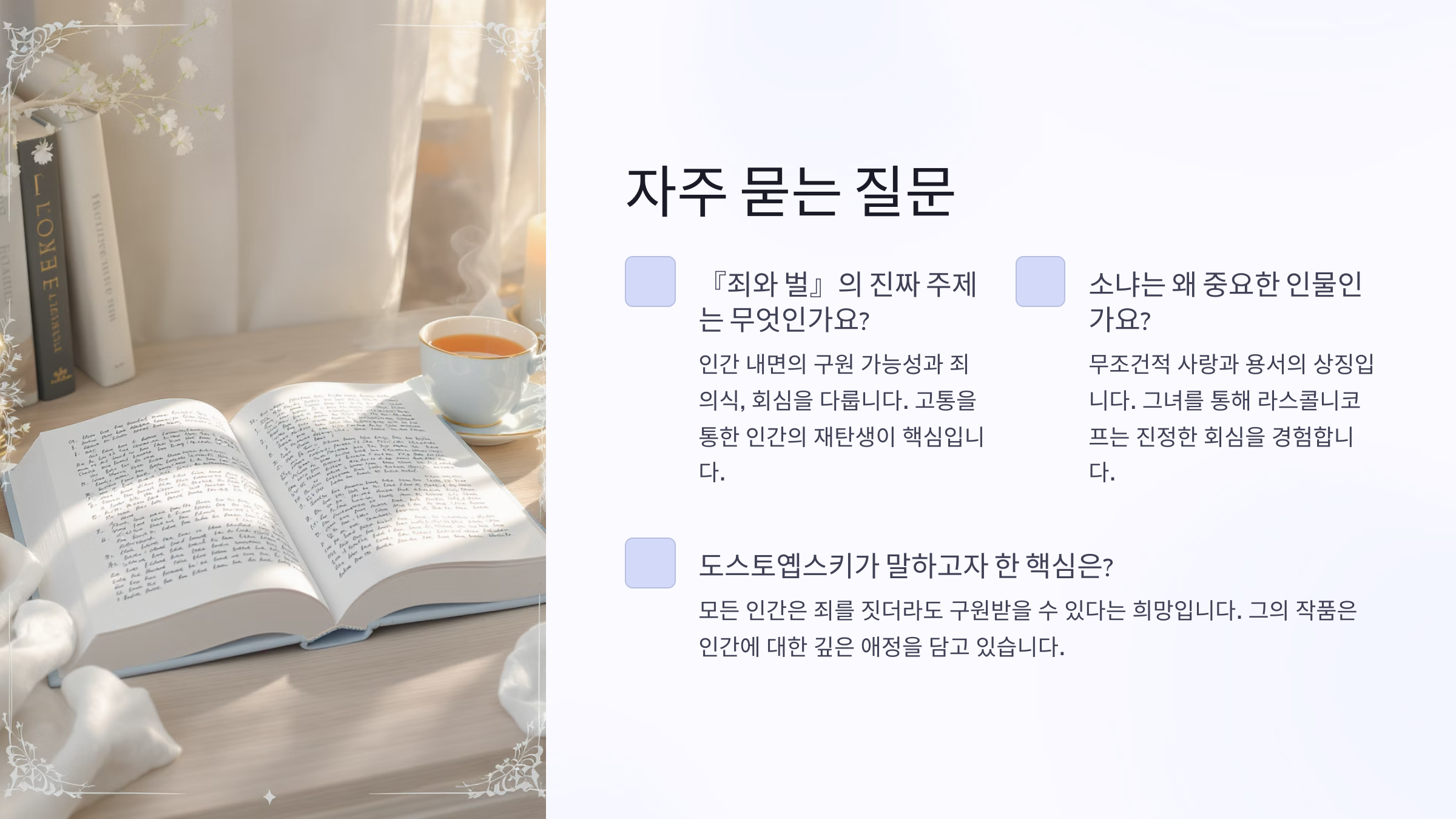 A1. 도스토옙스키는 죄와 벌을 통해 인간 내면의 구원 가능성과 죄의식, 회심을 다뤘어요. 핵심은 “인간은 고통을 통해 다시 태어날 수 있다”는 메시지예요.