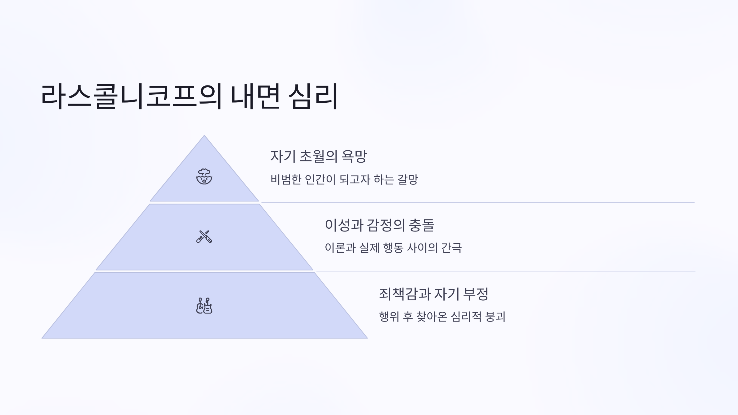 라스콜니코프의 내면에는 이상과 현실의 충돌, 논리와 감정의 대립, 그리고 죄와 구원 사이의 끝없는 갈등이 자리하고 있어요. 살인을 저지르고도 끊임없이 자책하고 고통받는 그의 모습은 인간 심리의 복잡성을 극적으로 보여줘요.