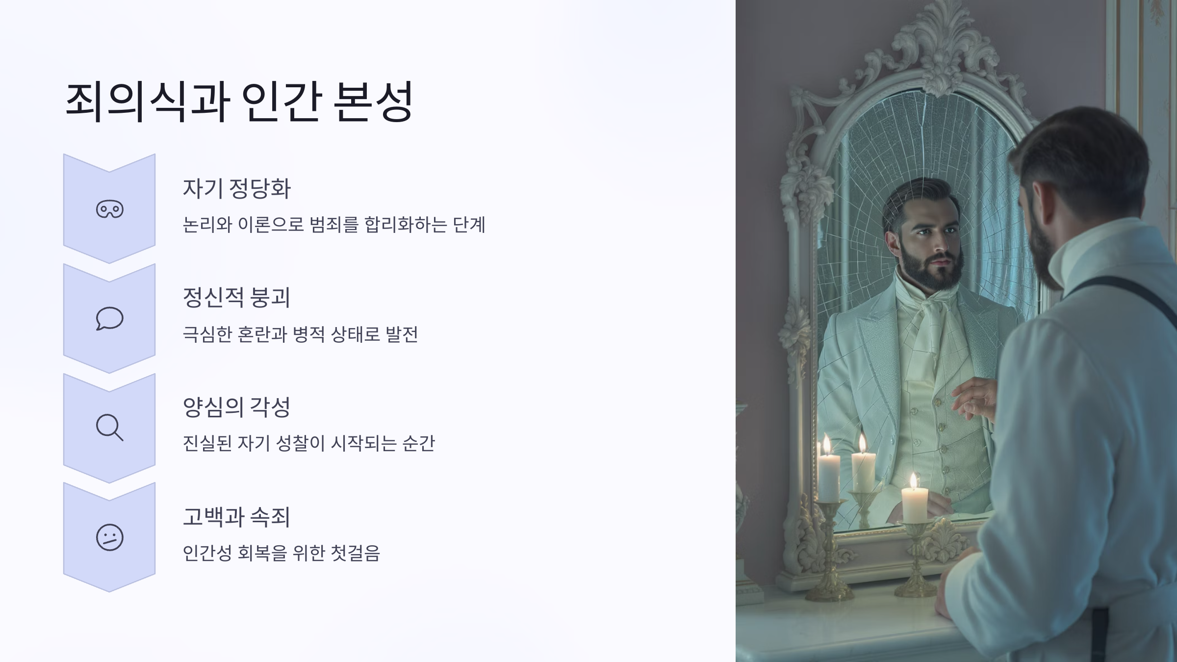 이 죄의식은 단순히 살인이라는 행위 때문이 아니라, 자신이 인간임을 잊고 ‘이론’만을 좇았다는 자각에서 비롯돼요. 그는 사람의 생명을 빼앗는 순간부터 더 이상 ‘이성적 인간’이 아니라 ‘양심의 포로’가 되어버린 거예요.