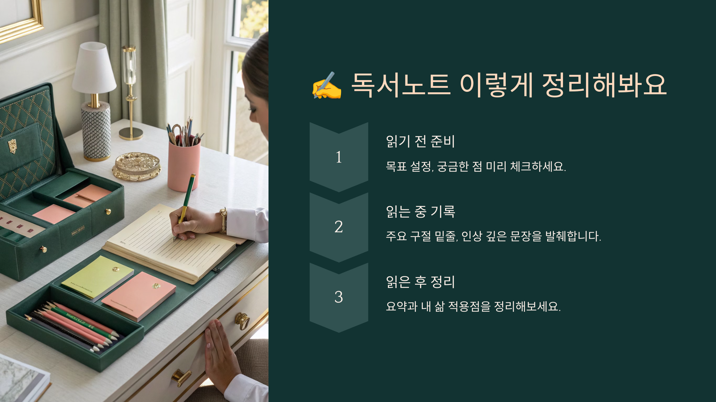 이 방법들을 번갈아 사용하면 단순한 독서가 아니라 ‘지속적인 학습’으로 연결돼요. 👍