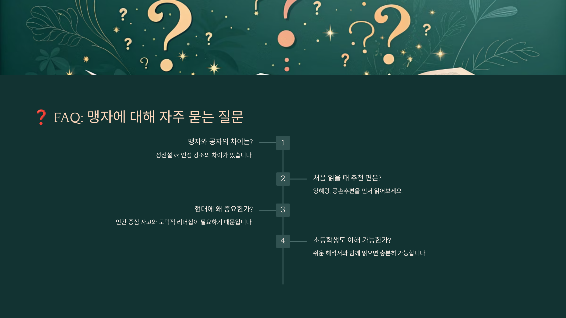 맹자는 공자의 사상을 계승하고 현실 정치를 비판하며 인간의 본성을 깊이 탐구한 유학자예요. 그의 책은 단순한 고전이 아니라 지금도 우리 삶에 살아 있는 지혜의 보물창고랍니다.