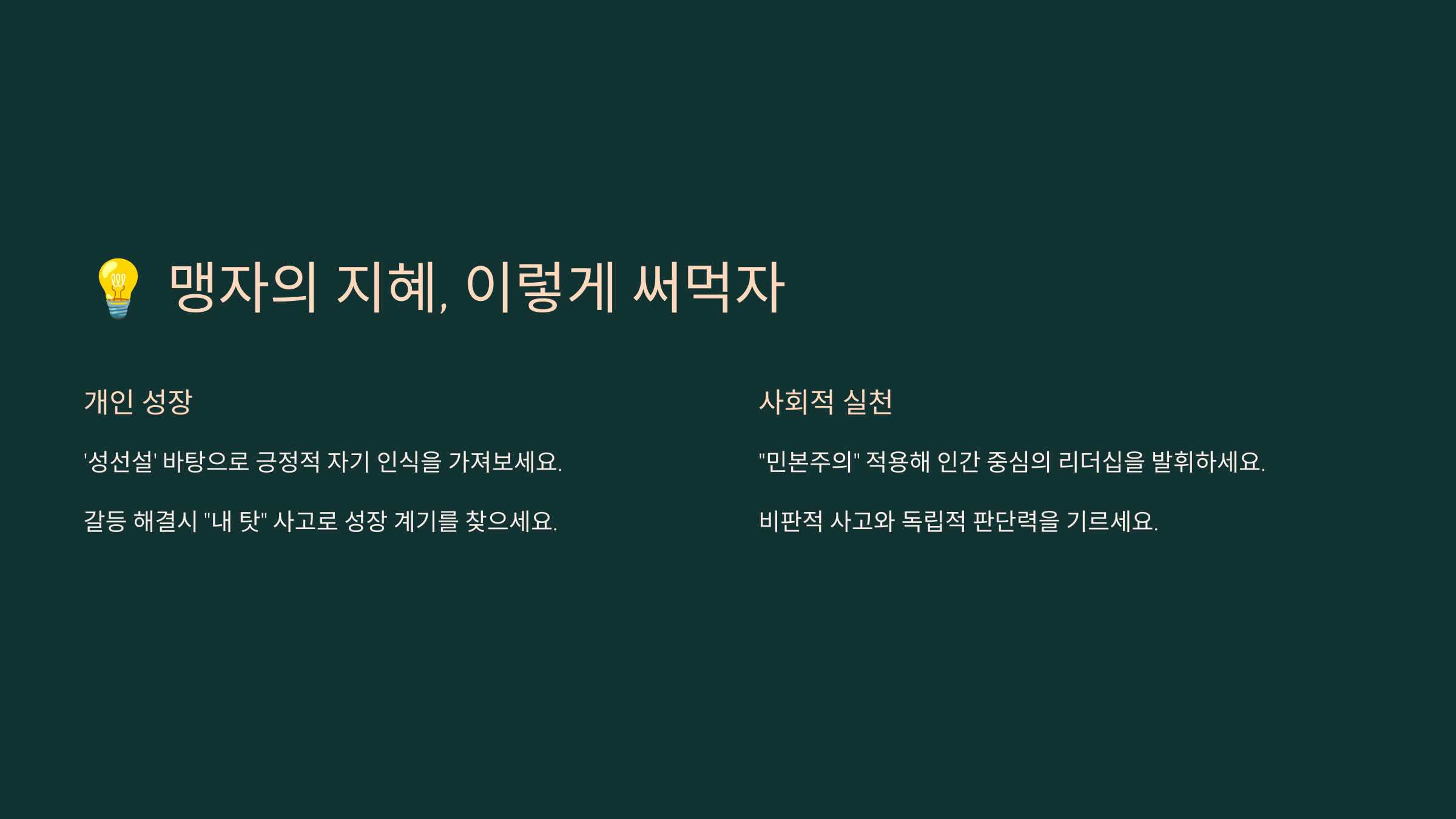 예를 들어, 회사에서 비양심적인 일을 강요받을 때 “도를 지켜야 한다”는 맹자의 말은 내 마음을 붙잡아주죠. 또는 아이를 키울 때 교육 환경의 중요성을 맹모삼천으로 떠올릴 수 있고요.