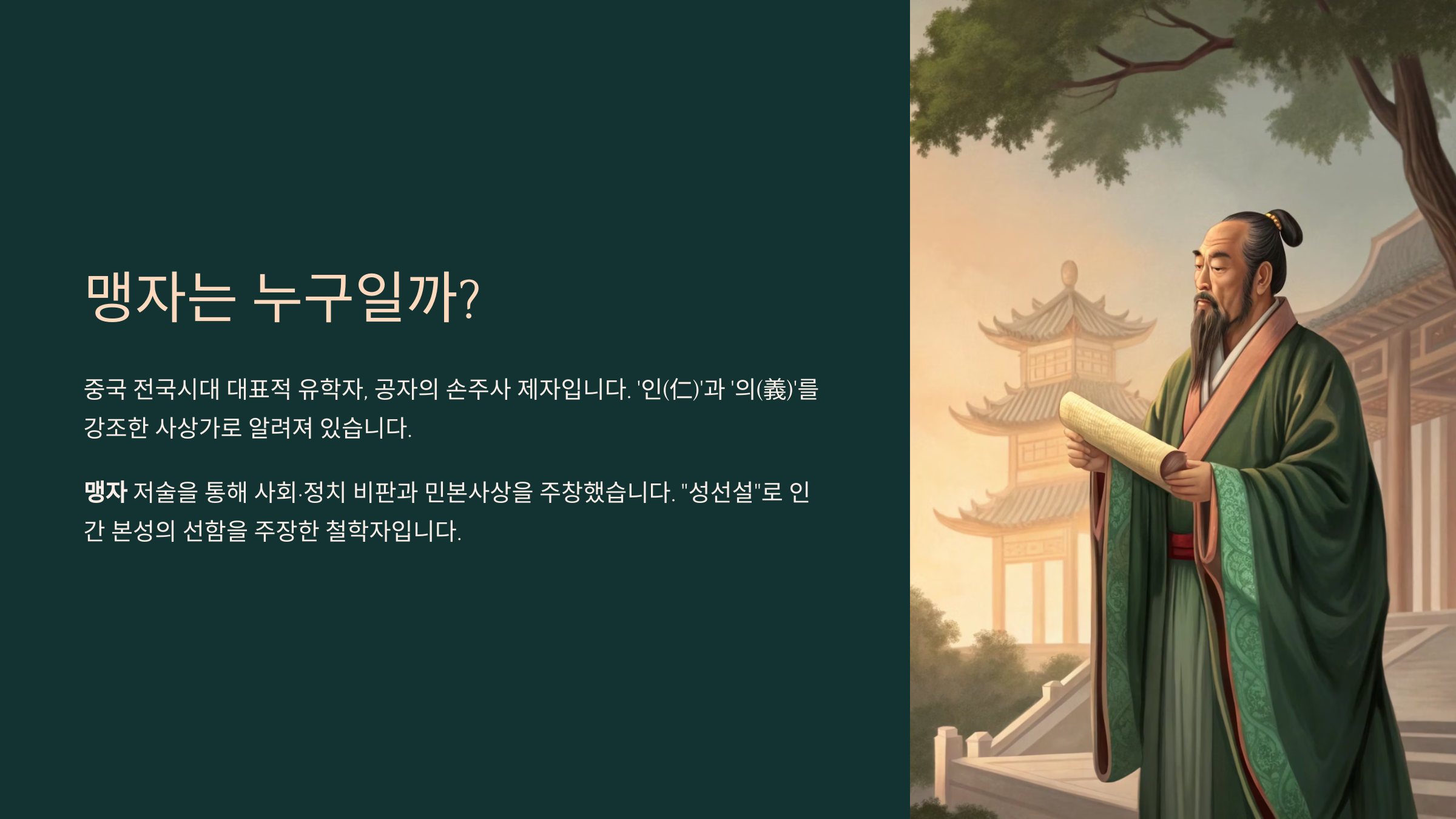 맹자는 기원전 4세기경 중국 전국시대에 살았던 유학자로, 본명은 맹가(孟軻)예요. 공자의 사상을 계승했으며, 특히 ‘성선설(性善說)’이라는 인간 본성에 대한 철학을 펼쳤죠.