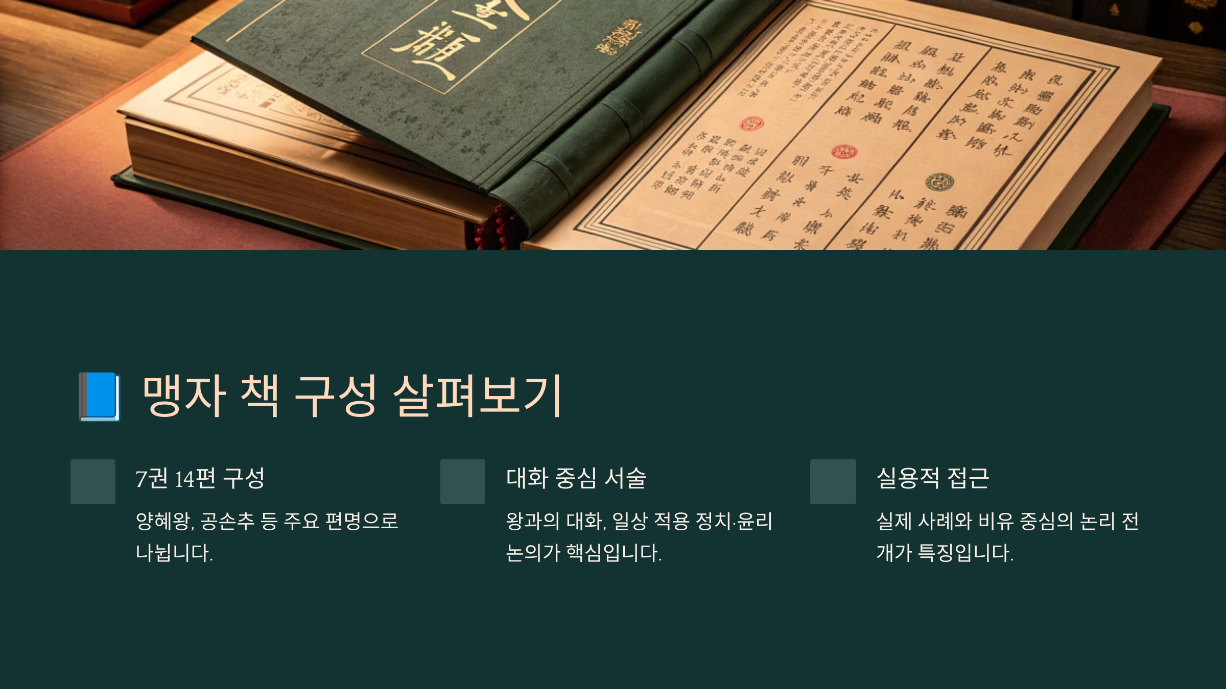 『맹자』는 총 7편으로 구성되어 있어요. 각각의 편은 맹자가 주장한 사상과 실제 논변 내용을 담고 있죠. 이 글들은 모두 ‘대화체’ 형식이기 때문에, 읽을수록 생생하게 상황이 떠오른답니다.