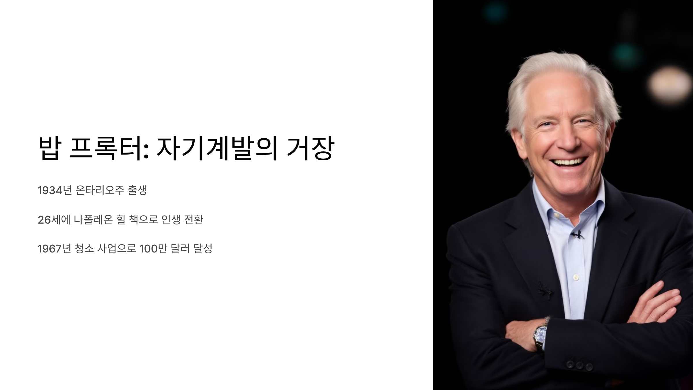 밥 프록터는 1960년대부터 자기계발 업계에서 활동을 시작했어요. 그는 처음에는 보험 영업사원으로 일하며 성공을 경험했지만, 곧 더 많은 사람들에게 성공 원리를 가르치는 것이 자신의 사명임을 깨닫게 되었죠. 🏆