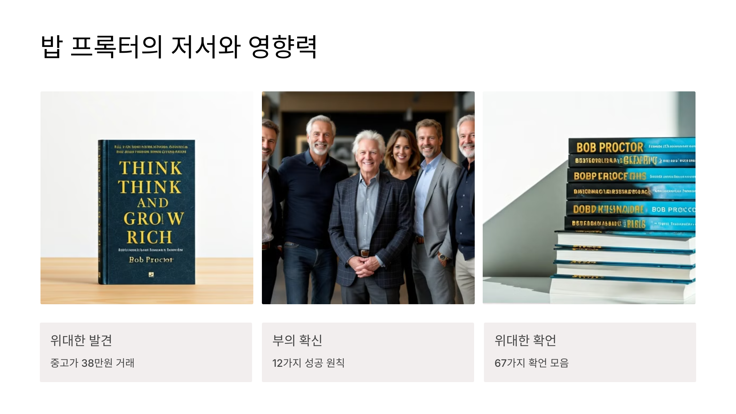 밥 프록터의 삶은 단순한 '성공 스토리'가 아니에요. 그는 '생각의 힘'을 믿었고, 그것을 현실로 만드는 방법을 끊임없이 연구했어요. 그의 이야기는 우리에게 꿈을 이루는 힘이 생각보다 가까이에 있다는 걸 알려주죠. 🌟