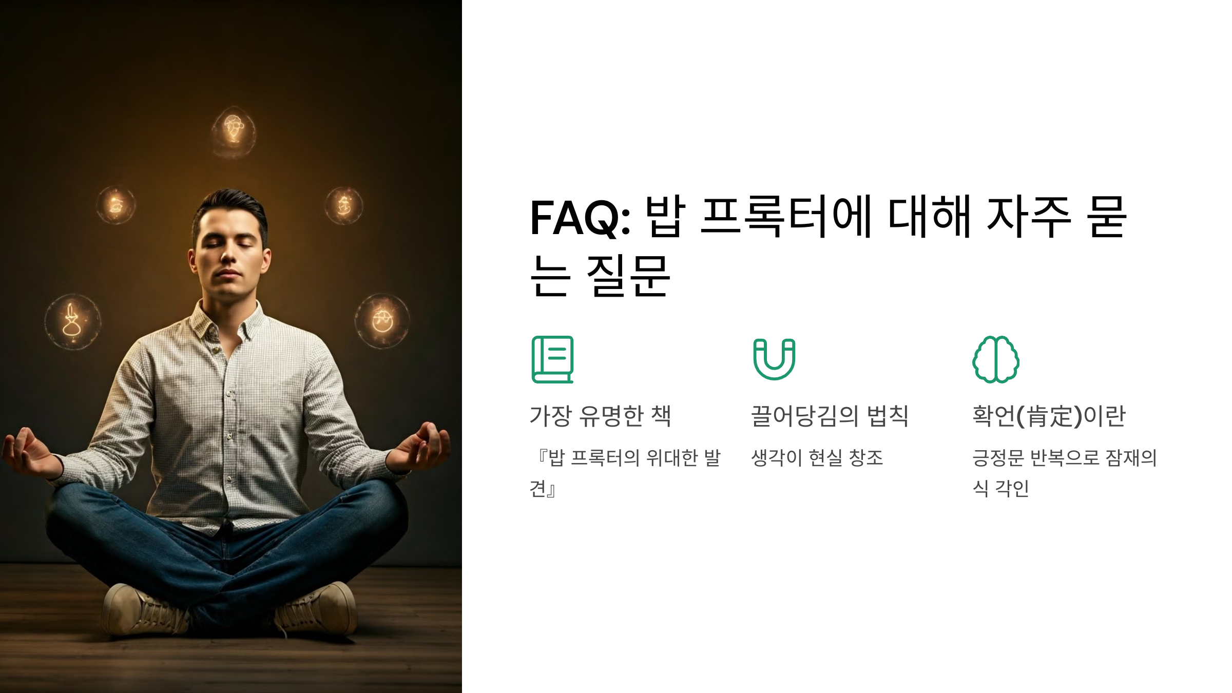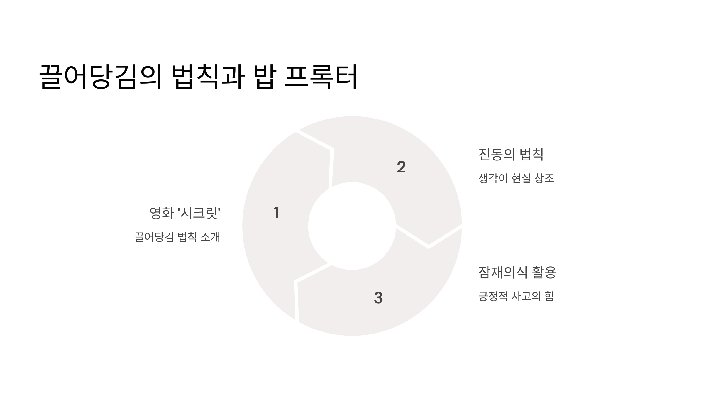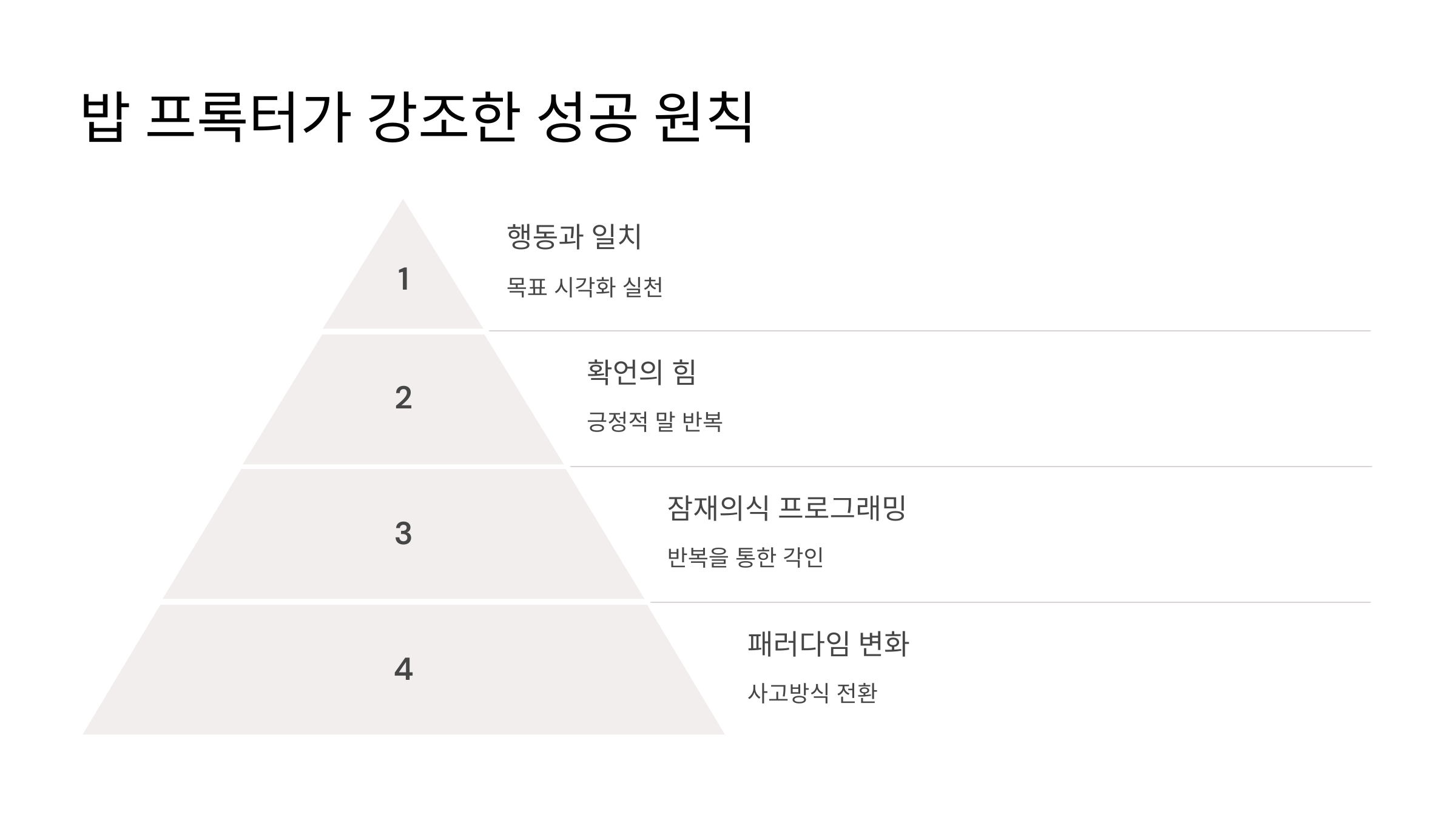 밥 프록터는 단순히 끌어당김의 법칙을 이야기하는 것이 아니라, 성공을 위한 구체적인 원칙을 강조했어요. 그는 ‘마음가짐’, ‘목표 설정’, ‘행동’ 이 세 가지 요소가 성공을 결정짓는다고 믿었어요. 🏆