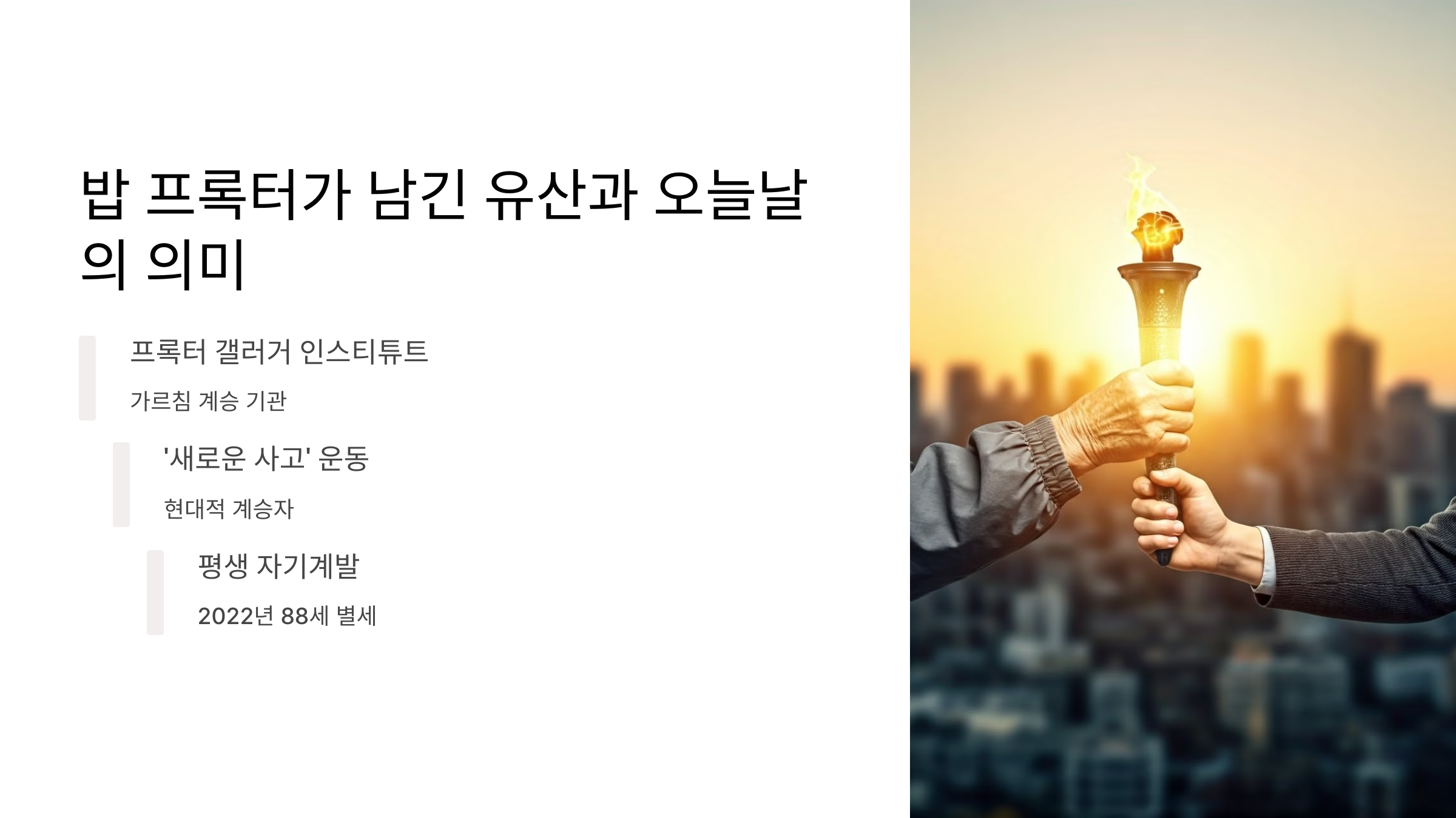밥 프록터는 2022년 세상을 떠났지만, 그의 철학과 가르침은 여전히 많은 사람들에게 영향을 미치고 있어요. 그는 수십 년 동안 사람들에게 ‘생각의 힘’을 믿고 원하는 삶을 창조할 수 있다는 확신을 심어줬죠. 🌎