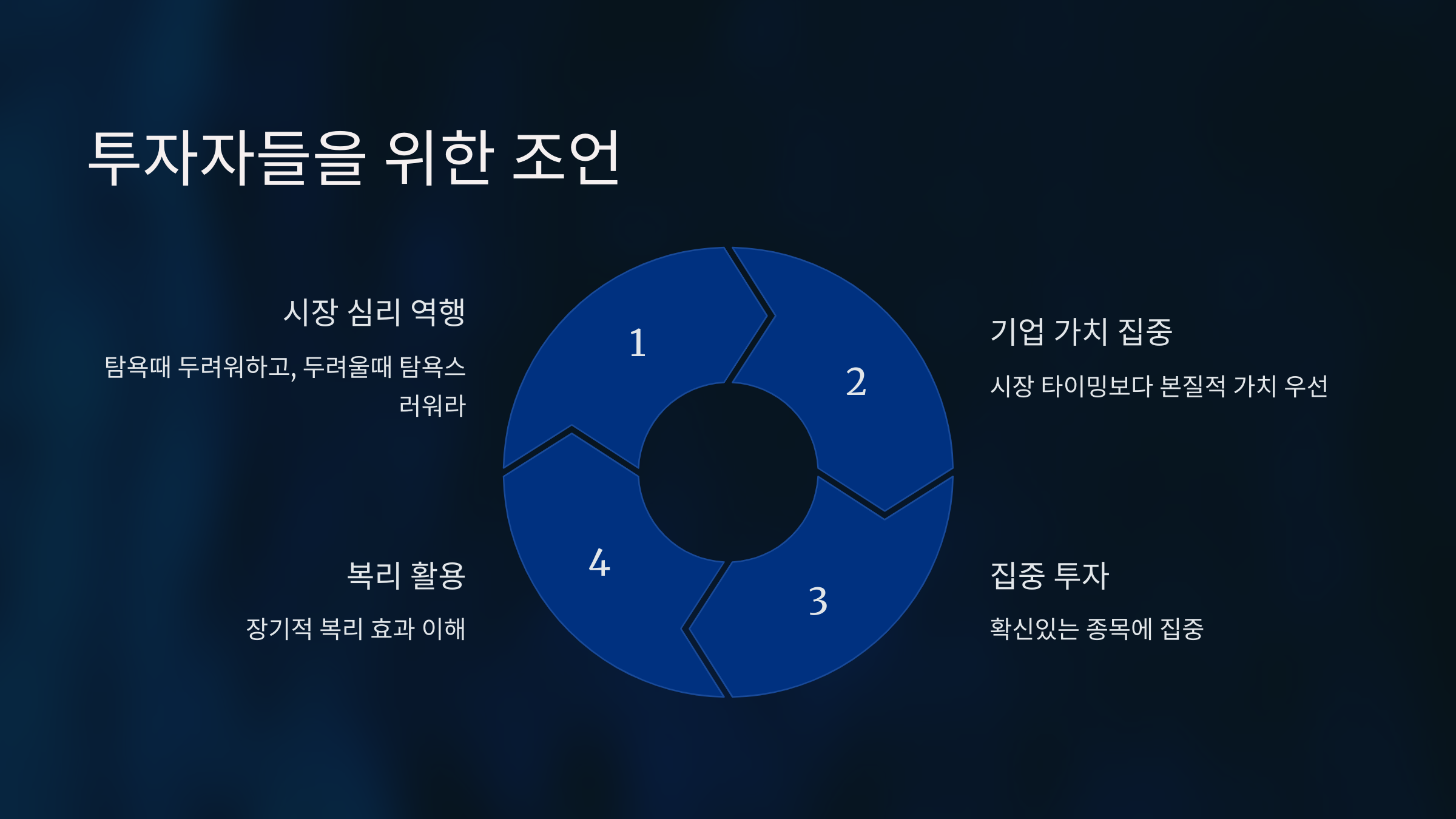 버핏의 성공 비결은 바로 '우량 기업을 싸게 사서 오랫동안 보유하는 것'이에요. 단기적인 시장 변동에 휘둘리지 않고, 장기적인 비전을 보고 투자하기 때문에 꾸준한 성과를 내고 있죠.